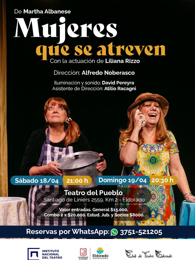 Las funciones se realizarán el sábado 18 de abril a las 21:00 y el domingo 19 a las 20:30, en la sala ubicada sobre calle Santiago de Liniers 2559, Km 2 de Eldorado. Las entradas generales tienen un valor de 15.000 pesos, con promociones de dos por 20.000 y tarifas diferenciadas para estudiantes, jubilados y socios. Las reservas pueden realizarse a través de WhatsApp.