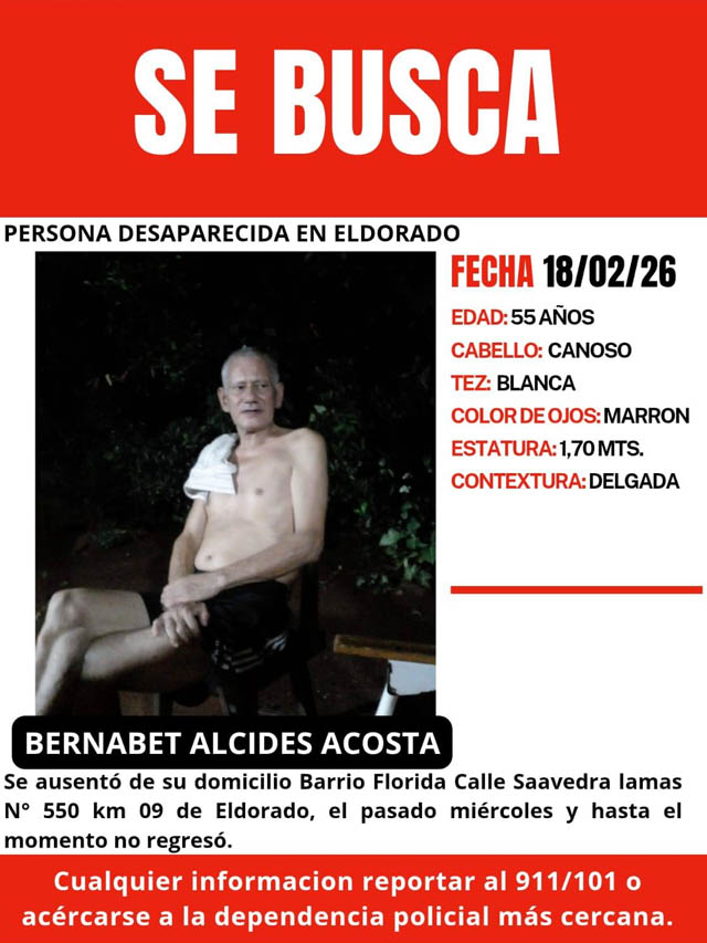 Según informaron fuentes policiales, Bernabet Alcides Acosta se ausentó de su domicilio ubicado sobre la calle Saavedra Lamas, en el kilómetro 9 de la localidad de Eldorado, sin que hasta el momento se tenga información precisa sobre su paradero.