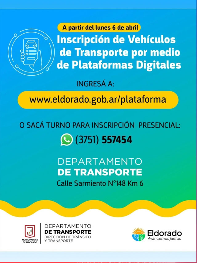 La Municipalidad de Eldorado informó que a partir del lunes 6 de abril se abrirá el proceso de inscripción para los vehículos que operan mediante plataformas digitales de transporte, en el marco de la regulación de este tipo de servicios en la ciudad.