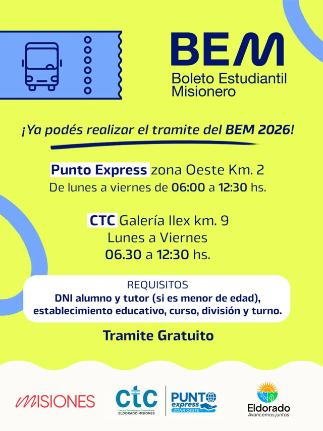 AGENCIA MISIONES.UNO | Ya se encuentra habilitada la gestión del Boleto Estudiantil Misionero 2026 en Eldorado. El trámite puede realizarse en Punto Express (Km 2) y en el CTC Galería Ilex (Km 9), de lunes a viernes, y es gratuito.
