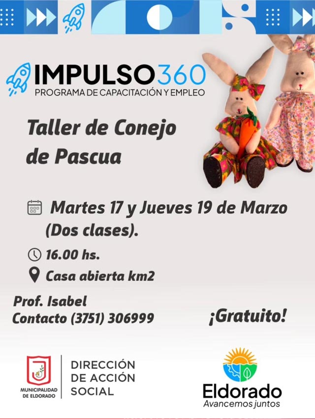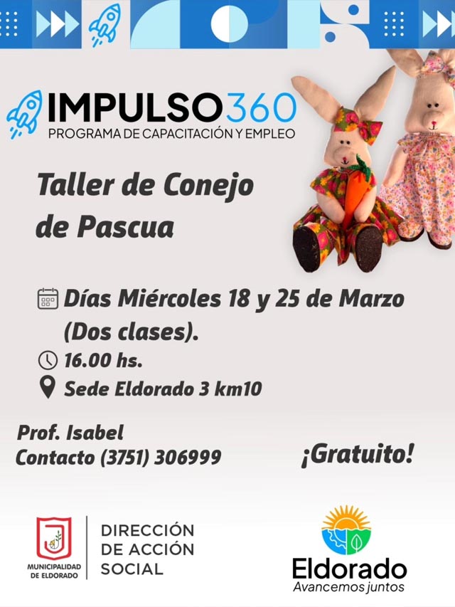 AGENCIA MISIONES.UNO | En la ciudad de Eldorado se realizará un nuevo taller gratuito en el marco del programa Impulso 360, destinado a enseñar a los participantes a confeccionar su propio conejo de Pascua en tela, una propuesta pensada para promover el aprendizaje de técnicas artesanales.