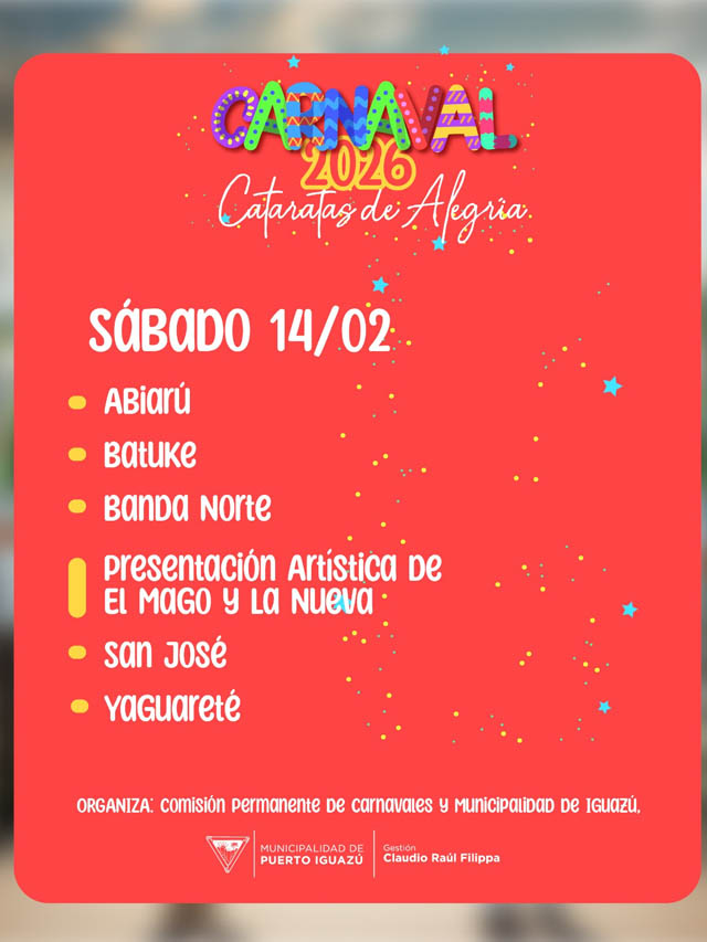 AGENCIA MISIONES.UNO | La ciudad de Puerto Iguazú se alista para celebrar una nueva edición del Carnaval “Cataratas de Alegría”, que se desarrollará los días 13, 14 y 15 de febrero, a partir de las 19 horas, en la costanera Eduardo Arrabal.
